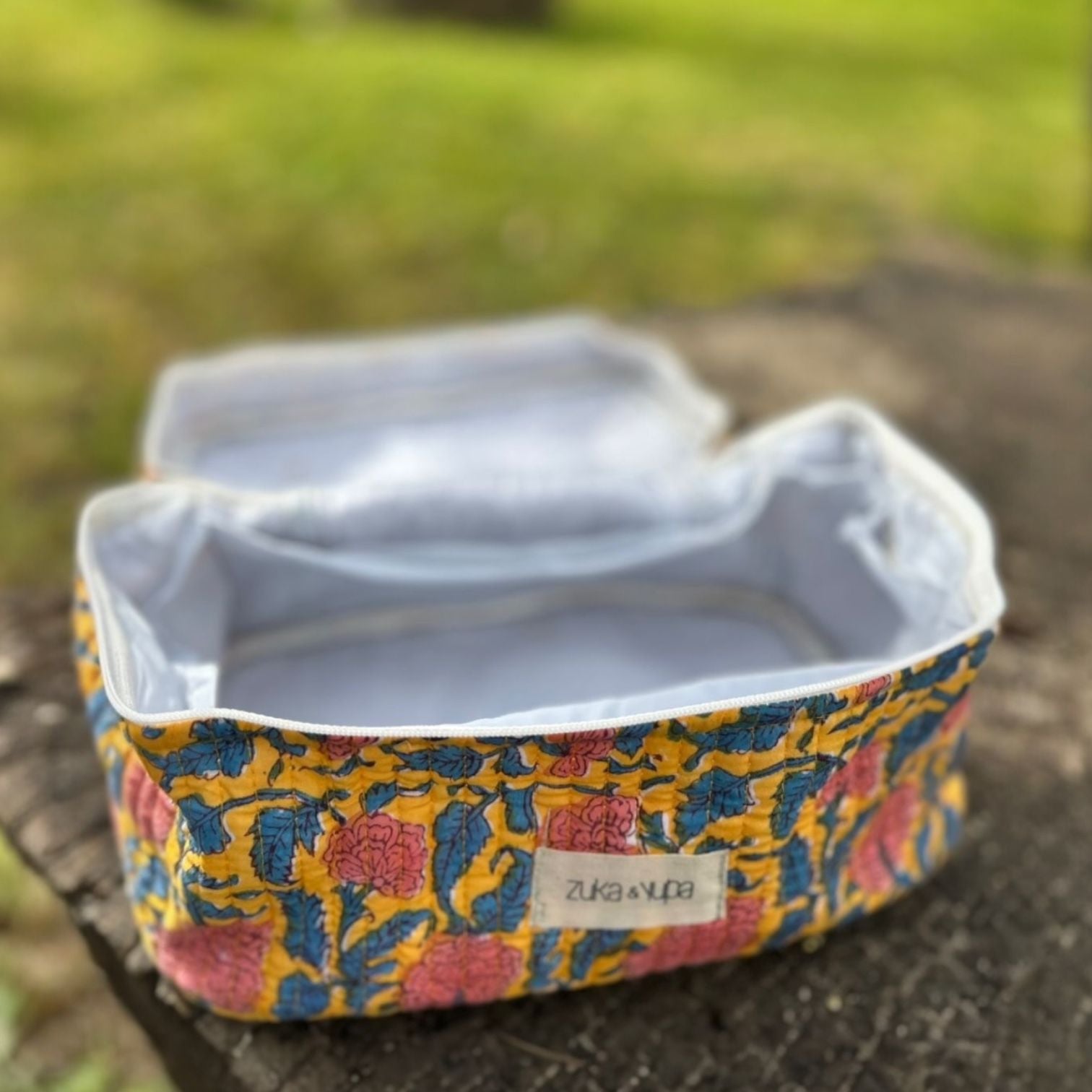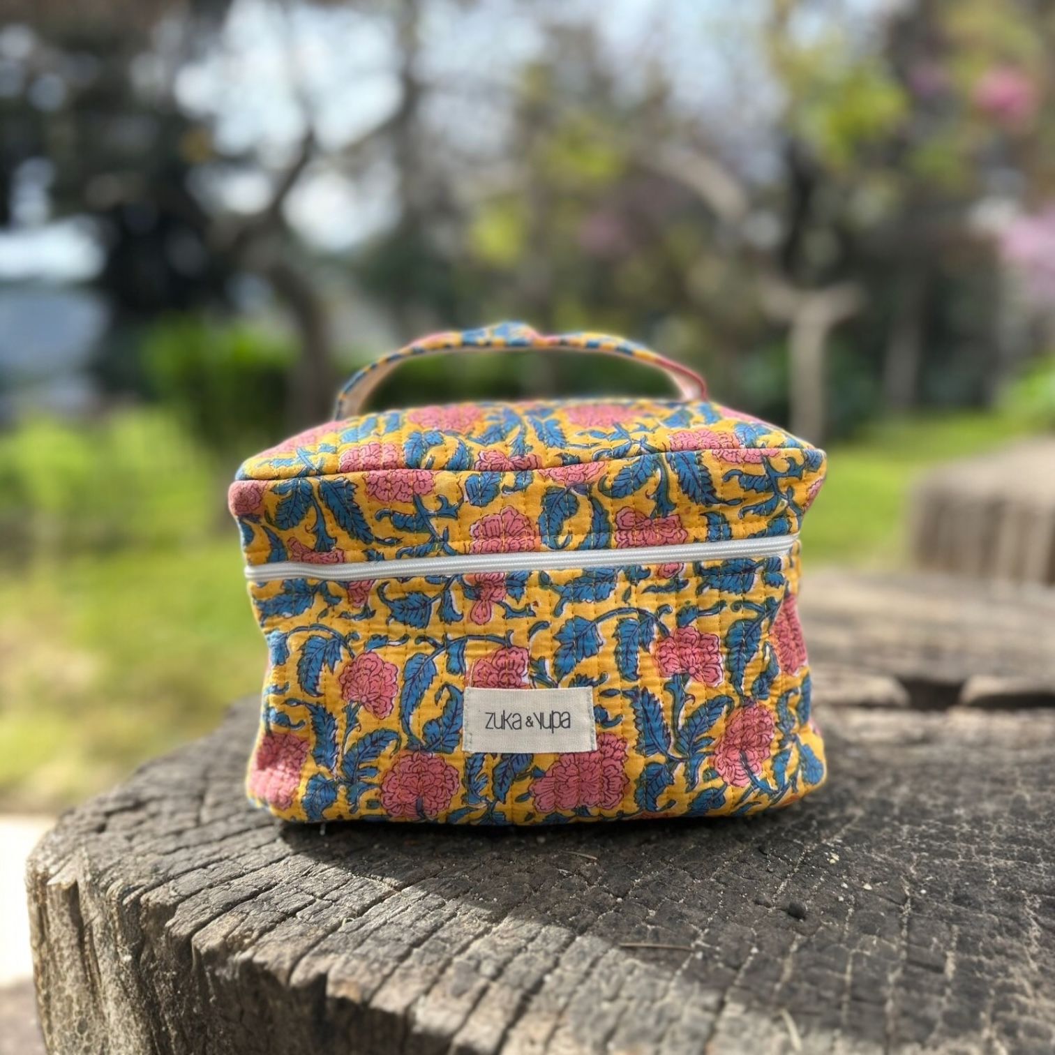 Nuestro neceser Palermo es ideal para tu día a día o para llevar de viaje. Hecho a mano en la India con la tradicional técnica de estampado en madera Block Print, cada pieza es única y refleja el encanto del trabajo artesanal.